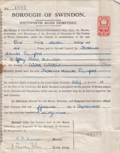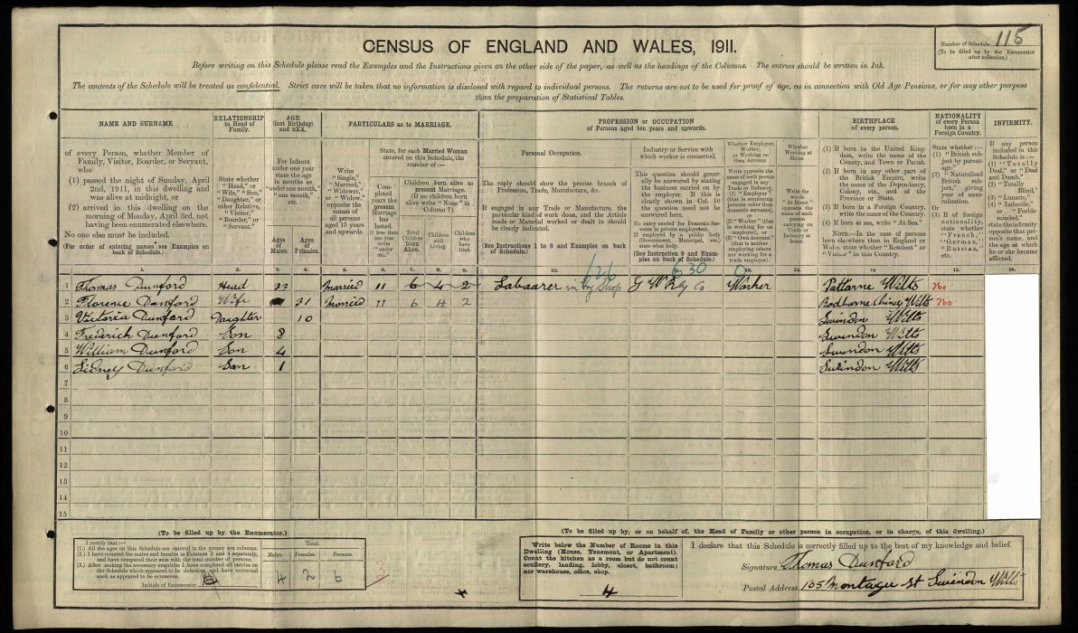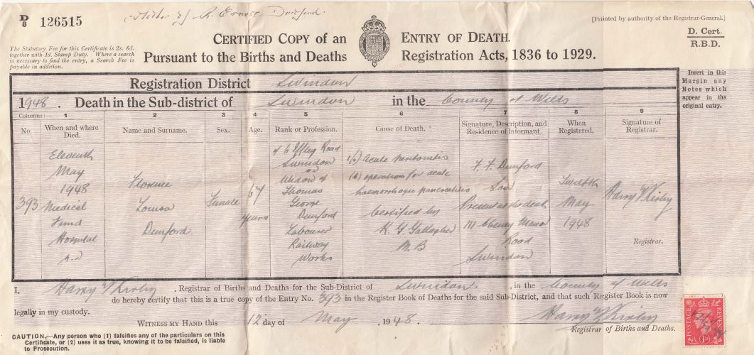 | Florence Louisa Dunford | 42 | Wife | Haydon, Wiltshire | Home duties |