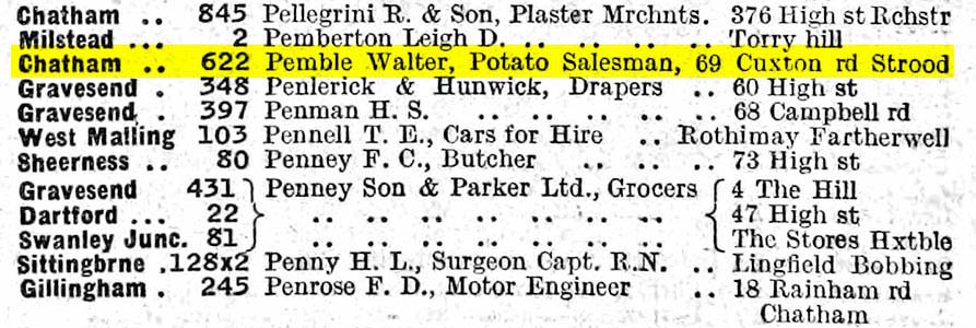 | Walter Henry Pemble | 54 | Head | Kent, Chatham | Potato Merchant (Employer, at home). Home duties |