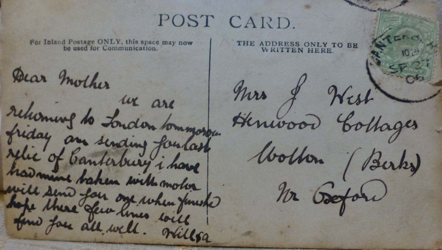 Postcard sent from William West to his mother, Rosetta (Mrs J West):
