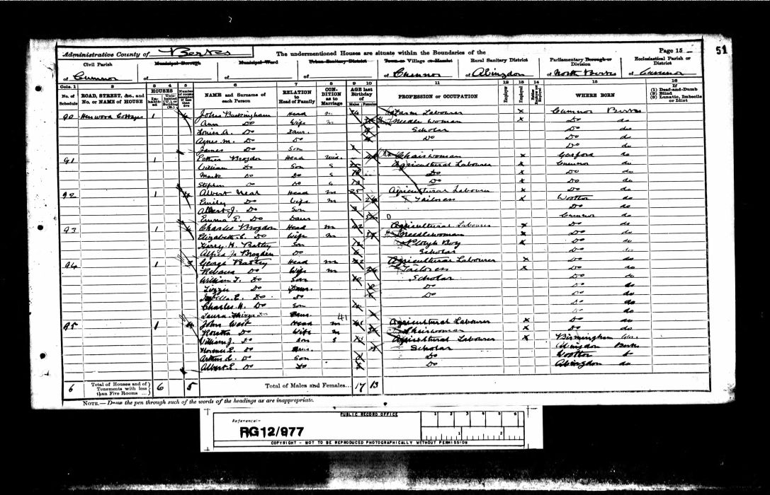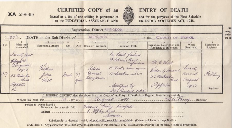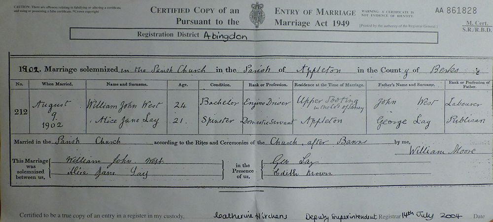 | Alice Jane West | 40 | Wife | Cumnor, Berks | Home duties |