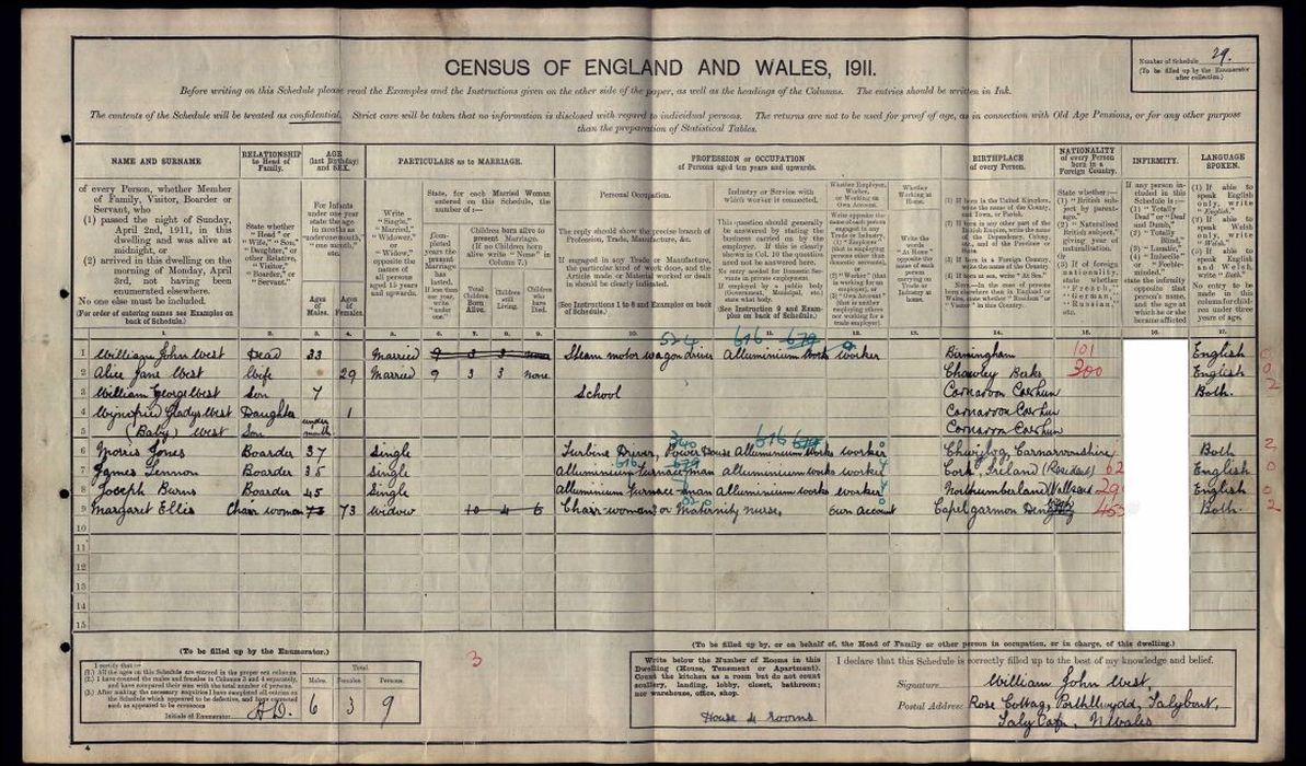 | William John West | 43 | Head | Birmingham, Warwickshire | Motor wagon driver, The Aluminium Corp, Dolgarrog Works |